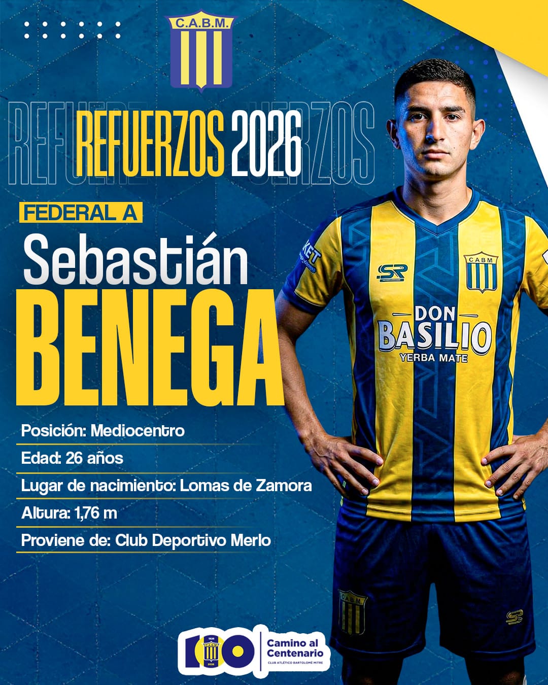 Sebastián Benega se suma al mediocampo del Auriazul, proveniente de Deportivo Merlo, con 26 años y experiencia Liga Profesional, Copa Argentina y B Nacional. Además, vistió las camisetas de Talleres de Remedios de Escalada, Banfield, Güemes y Estudiantes de Caseros.