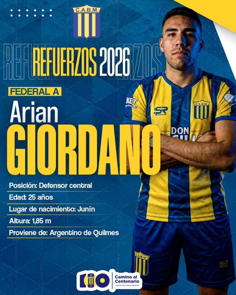 También selló su llegada el defensor central Arian Giordano (25), quien viene de jugar en Argentino de Quilmes y en su carrera futbolística refleja pasos por importantes clubes como Central Norte, Almagro y Sarmiento de La Banda. Además de conocer el Federal A, disputó partidos en la Primera B, la B Nacional y Copa Argentina.